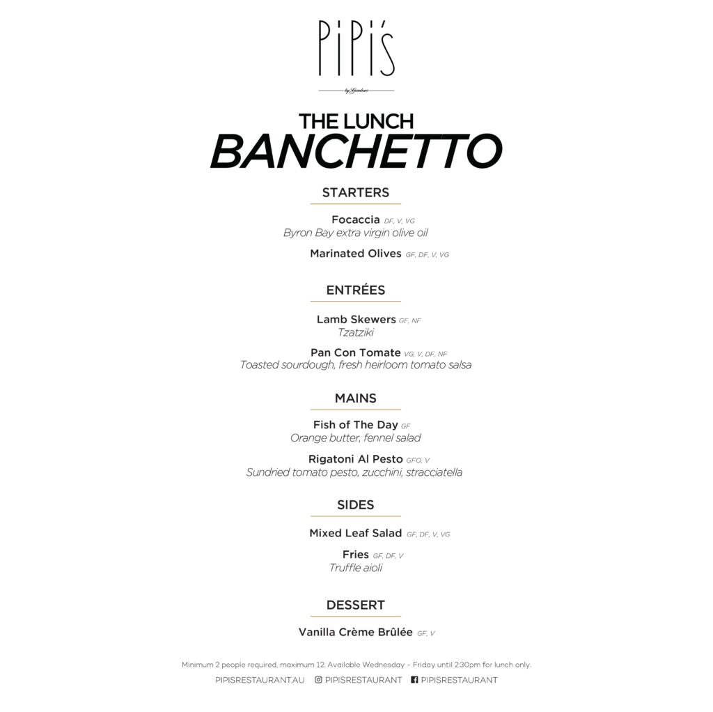 Back by popular demand. The Banchetto at Pipi’s returns — a generous shared feast inspired by the flavours of Europe. Enjoy rigatoni al pesto, fish of the day and succulent lamb skewers, alongside marinated olives, mixed leaf salad and crispy fries, served with warm focaccia and finished with a velvety vanilla crème brûlée. Gather your table and come hungry — $65pp.